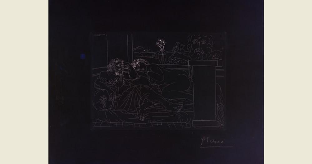 Pablo Picasso LE REPOS DU SCULPTEUR IV. 1933 acquaforte su rame, cm 19,1x26,5, foglio, cm 34,2x44,5 Baer/Geiser, 327. Firmata a matita e datata in controparte sulla lastra 4 avril, Paris XXXIII. Tavola nel II stato su 2 per la Suite Vollard stampata da Lacourière nel 1939 per Edition Vollard. Bellissima impressione stampata su carta vergellata Montval con filigrana Picasso. Grandi margini editoriali, due lievi macchie al margine sinistro fuori dall’area incisa.
