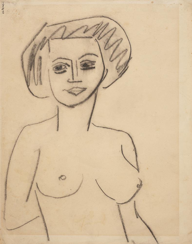 Ernst Ludwig Kirchner ATELIERSZENE (recto) WEIBLICHER AKT (verso) Gessetto nero su carta avana, cm 45,5x36 Al verso timbro del Nachlass E.L.Kirchner (Lugt, 1570b) con il numero "K Dre/Bg 127" e annotazione "K(???)" apposta a matita. Al recto un secondo timbro inventariale non identificato. Databile intorno al 1908/1910 L’opera è registrata presso l’archivio Ernst Ludwig Kirchner, Wichtrach/Berna. Provenienza: Lascito dell’artista, Davos/Basilea/Stoccarda Studio d’Arte Scacchi Gracco, Milano (timbro al recto) Galleria d’Arte Galatea, Torino (timbro al recto) Collezione privata, Torino