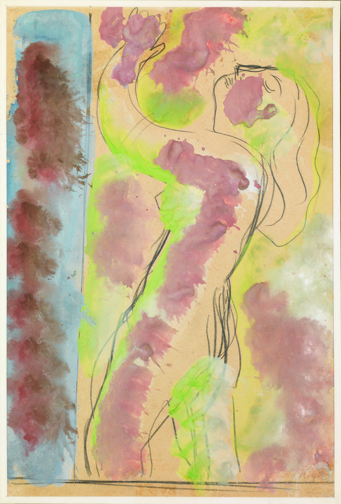 Mario Sironi NUDO FEMMINILE CON LE BRACCIA ALZATE matita nera e acquerello policromo su carta, cm 30x19,5 Databile agli Anni Quaranta. L'opera è accompagnata da autentica di Francesco Meloni su fotografia, datata 4 Novembre 1989 Provenienza: Collezione privata, Roma