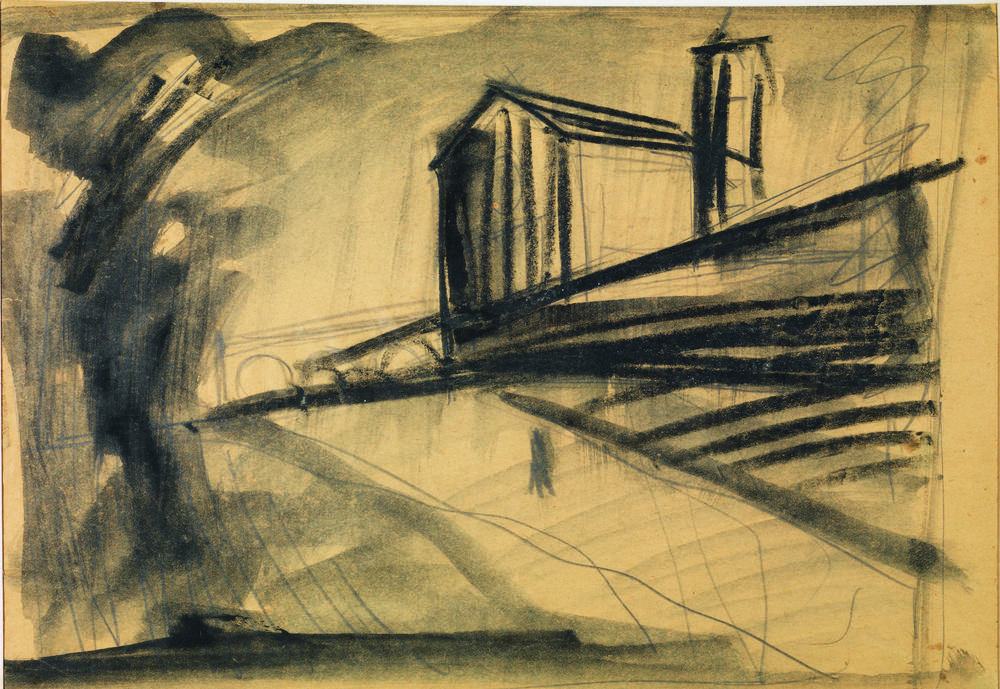 Mario Sironi PAESAGGIO CON CHIESA matita di grafite, inchiostro nero e gessetto nero su carta, cm 27x39 Databile alla fine degli Anni Quaranta L'opera è accompagnata da autentica di Francesco Meloni su fotografia datata 4 Novembre 1989 L’opera potrebbe costituire una prima idea per la scena del II atto, II quadro del "Don Carlos" rappresentato al Maggio Musicale Fiorentino nel 1950. Provenienza: Collezione privata, Roma