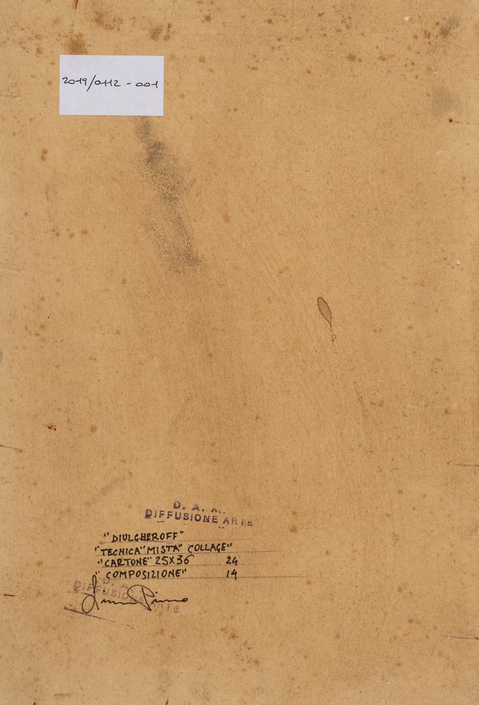 Nicolay Diulgheroff COMPOSIZIONE tecnica mista e collage su cartone, cm 36x25 firmato sul fronte: firmato sul retro del supporto: timbro D.A.M. Diffusione Arte Provenienza: D.A.M. Diffusione Arte Collezione privata, Torino