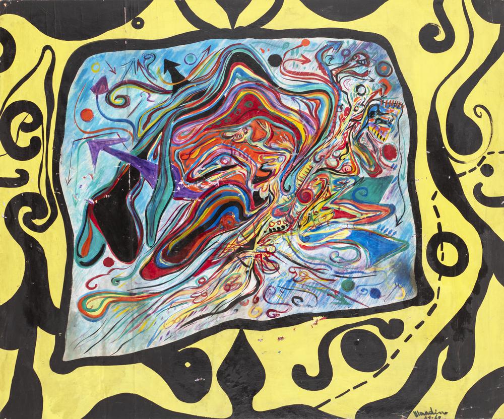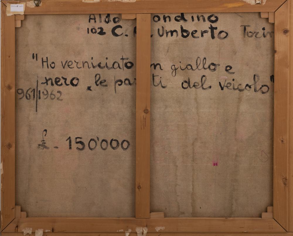 Aldo Mondino HO VERNICIATO IN GIALLO E NERO LE PARTI DEL VEICOLO olio su tela, cm 95x115 firmato e datato sul retro: firmato, titolato e datato eseguito nel 1961/1962 Per l'opera è stata avviata la richiesta di autentica presso l'Archivio Aldo Mondino Provenienza: Acquisita direttamente dall'artista dall'attuale proprietà
