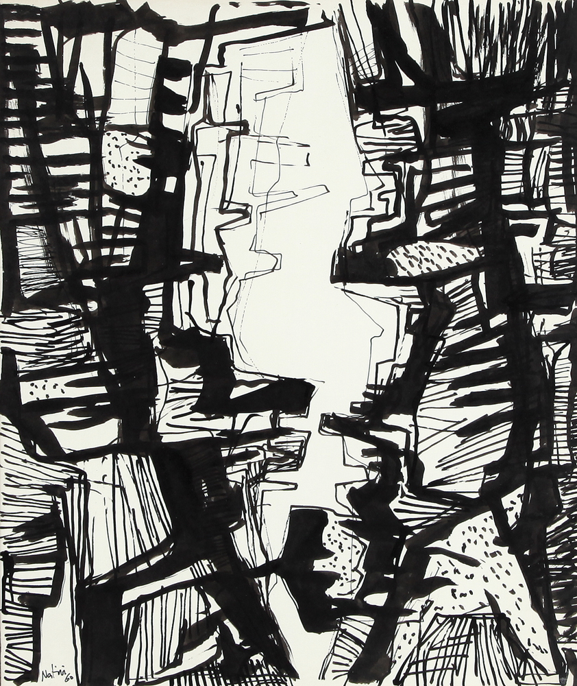 GUALTIERO NATIVI Pistoia 10/01/1921 - Greve in Chianti (Fi) 02/07/1999 Bozzetto, 1960 china su carta intelata cm. 52x43,5; firma e anno in basso a sinistra, timbro dell'Archivio Gualtiero Nativi al retro, opera registrata presso l'Archivio Gualtiero Nativi come da dichiarazione del figlio Berto su foto, pubblicato sul catalogo "Gualtiero Nativi, aristocrazia di segno, forma e colore.