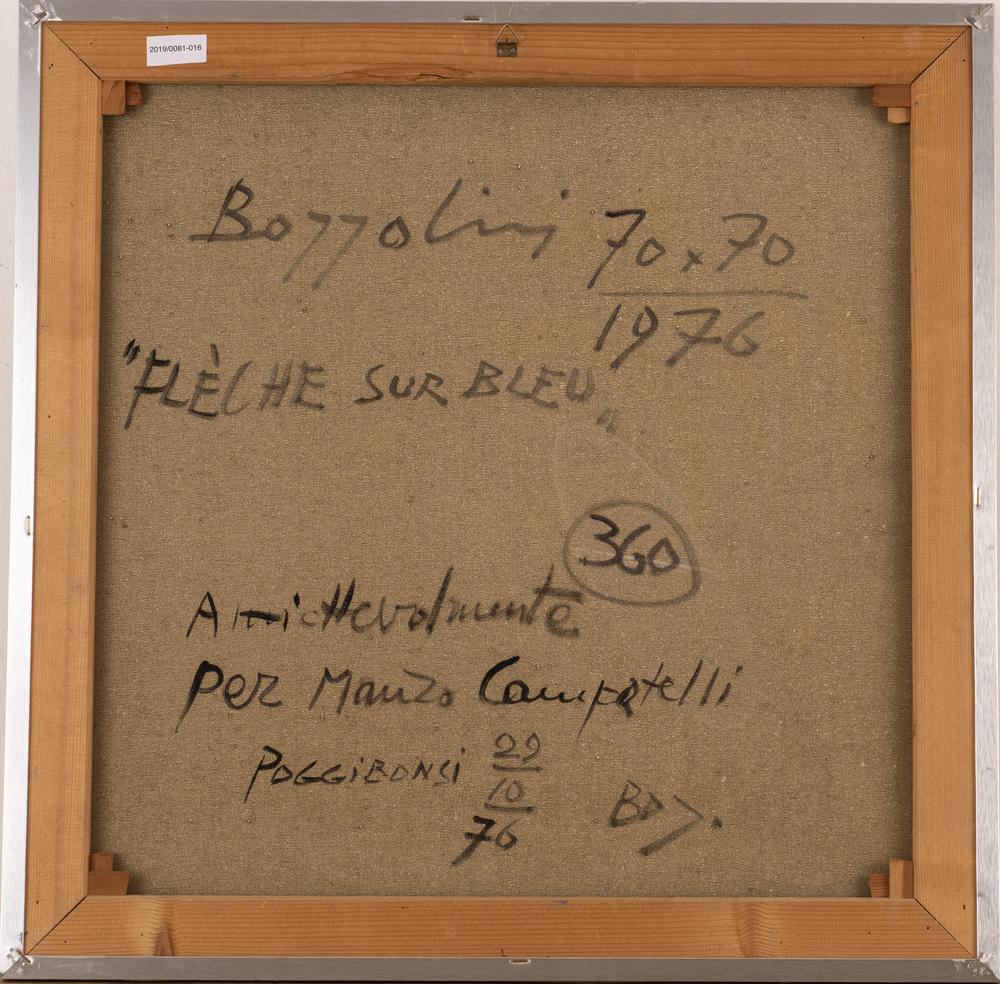 Silvano Bozzolini FLèCHE SUR BLEU olio su tela, cm 70x70 firmato e datato sul retro: firmato, titolato, datato e dedicato ad personam eseguito nel 1976 L'opera è accompagnata da autentica dell'artista su fotografia