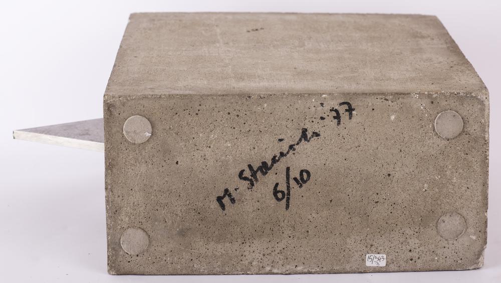 Mauro Staccioli COMPOSIZIONE cemento e acciaio inox, cm 30x40x15; es. 6/10 firmato, datato e numerato eseguito nel 1977 Edizioni Arser, Brescia L'opera è accompagnata da autentica dell'artista su fotografia su certificato di provenienza Provenienza: Edizioni Arser, Brescia Collezione privata, Milano