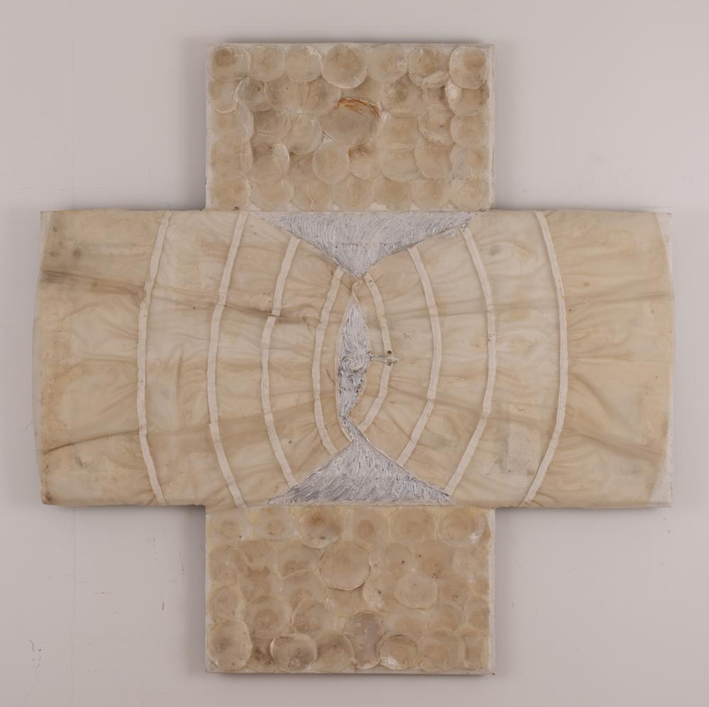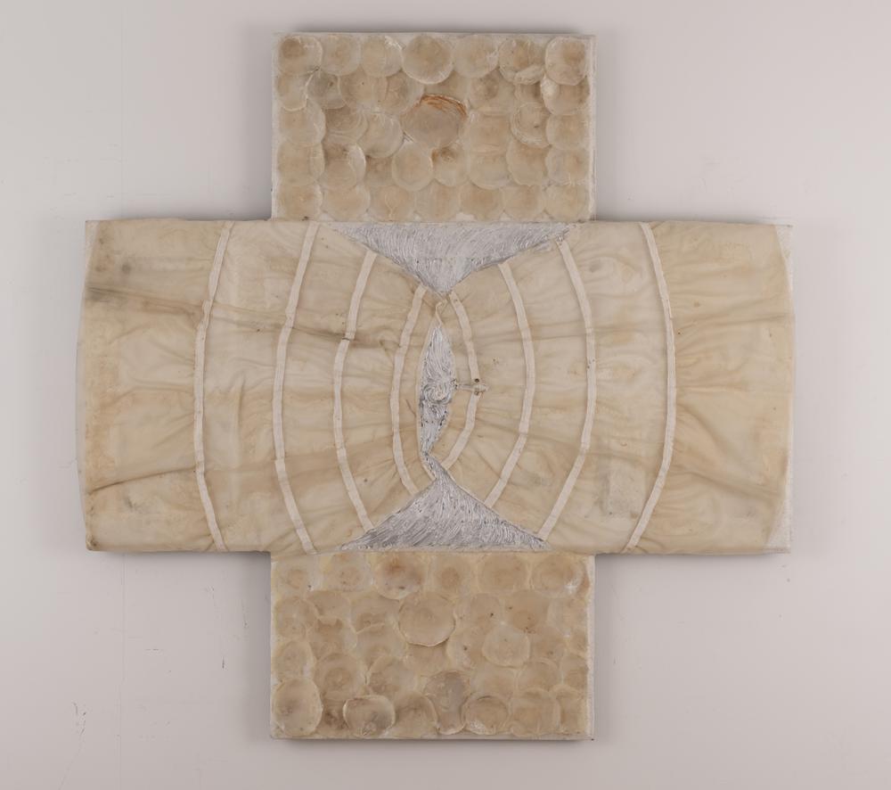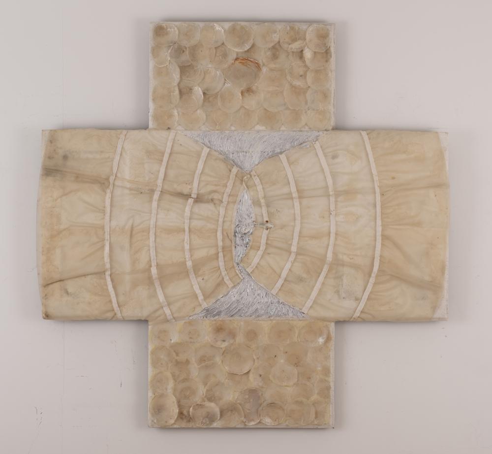 Bruno Ceccobelli LA SPOSADEL MARE olio, acrilico e madreperla su tavola sagomata a croce, cm 144x143 sul retro: titolato e firmato