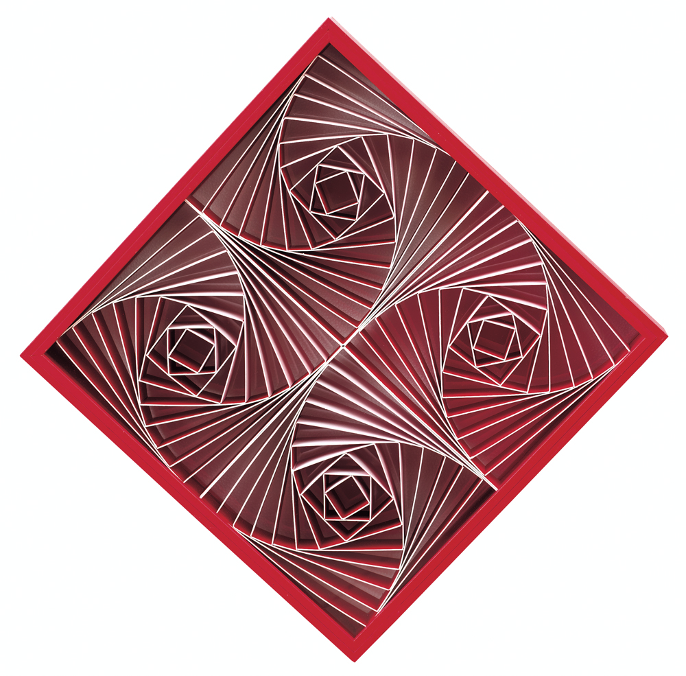 MANFREDO MASSIRONI Padova 1937 - Padova 01/12/2011 Quadrati ruotati rossi, 1964 assemblaggio di cartoncini, plastiche e legno romboidale cm. 75x75x7,5 (lato 53,5) opera non firmata, dichiarazione d'autenticità dell'artista su foto.