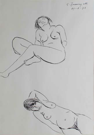 GIOVANNI FUMAGALLI Milano 1902 - 1995 DUE NUDI, 1972 china su carta, cm 63,5x44. Firmato e datato in alto a destra: G. Fumagalli 29 - 8 - 72. Provenienza:Milano, Galleria delle Ore (etichetta al verso)