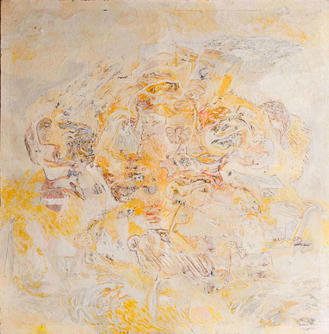 GIUSEPPE BASILE Capo d’Orlando 1952 PAESAGGIO CON AUTORITRATTO, 1974 olio su tela, cm 150x150. Firmato e datato inbasso a destra: Basile 1974. Provenienza:Milano, Galleria delle Ore (etichetta al verso). Opera accompagnata da una dichiarazione di provenienza della Galleria delle Ore firmata da Giovanni Fumagalli