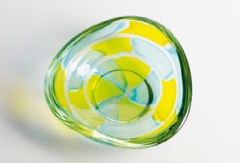 CENEDESE Coppa in vetro pesante trasparente con decori nei toni del giallo e del celeste. altezza: cm 7, lunghezza cm 24,5