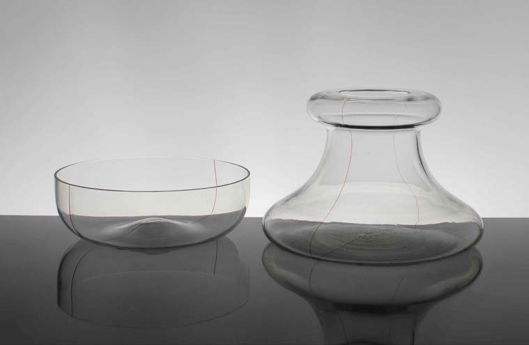 FRATELLI TOSO Lotto composto da coppa e vaso in vetrotrasparente con decoro formato da una sottile linea rossa. Reca etichetta (vaso): Fratelli Toso Murano Made in Italy. diametro cm 26 (coppa); altezza cm 21 (vaso).