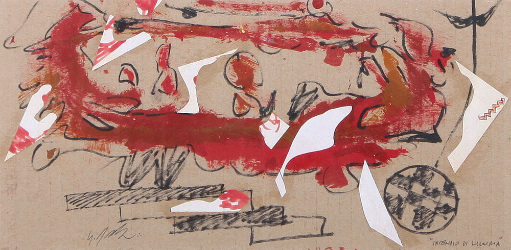 SERGIO DANGELO Milano 1932 Incendio in laguna tecnica mista su cartone ondulato cm. 17x34, firma in basso a sinistra, titolo in basso a destra, dichiarazione d'autenticità dell'artista su foto.