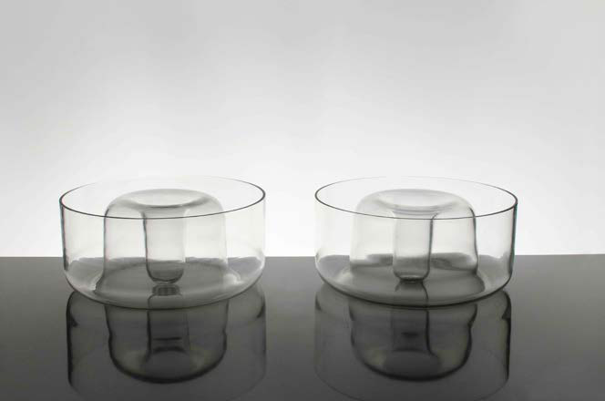 VISTOSI Coppia di centrotavola in vetro trasparente. Firma e data incise (un esemplare): Vistosi 73. altezza cm 14; diametro cm 30