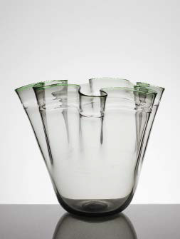 VISTOSI Vaso fazzoletto in vetro trasparente conbordo decorato nei toni del verde, anni ‘70. altezza: cm 34