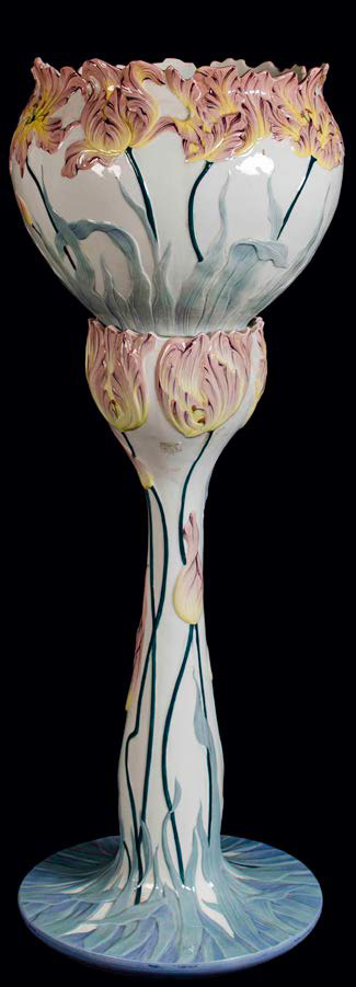 S.C.I. LAVENO Cache - pot in ceramica poggiante su basedecorata a motivo floreale. Difetti. Marchio sulle basi: Italiana Laveno.altezza complessiva: cm 113; diametro: cm 44