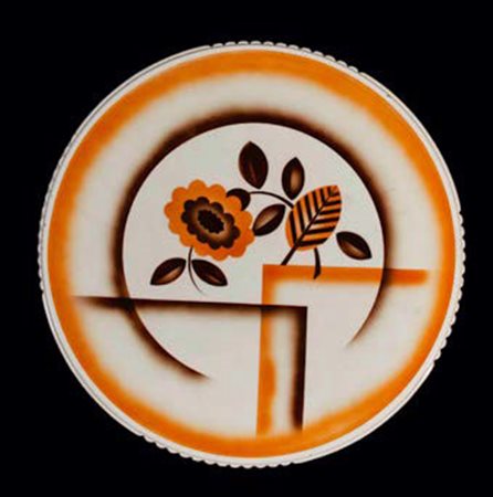 SPRITZDEKOR Piatto in ceramica con decorazioneaerografata a motivi geometrici e floreali. Marchio alla base: Germany 6477.diametro: cm 34,5