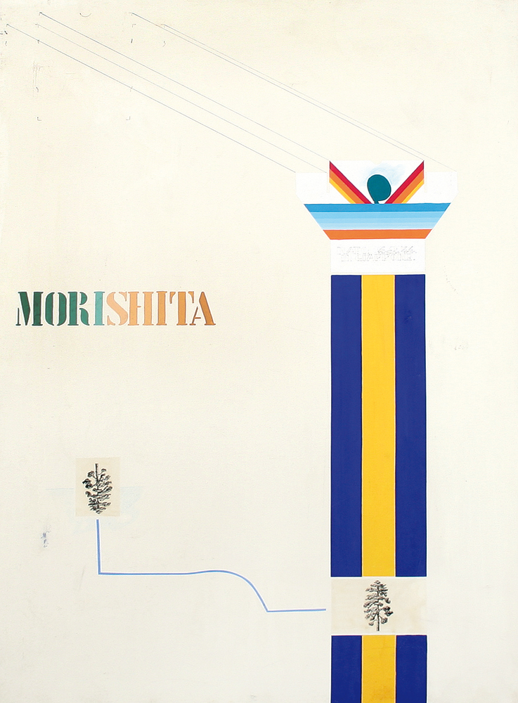 KEIZO MORISHITA Kitakyushu-Shi (Giappone) 1944 L'origine delle specie, 1967 olio, tecnica mista e collage su tela cm. 100x70, firma, titolo, anno e dichiarazione d'autenticità e provenienza firmata Pagani e datata 1974 al retro.
