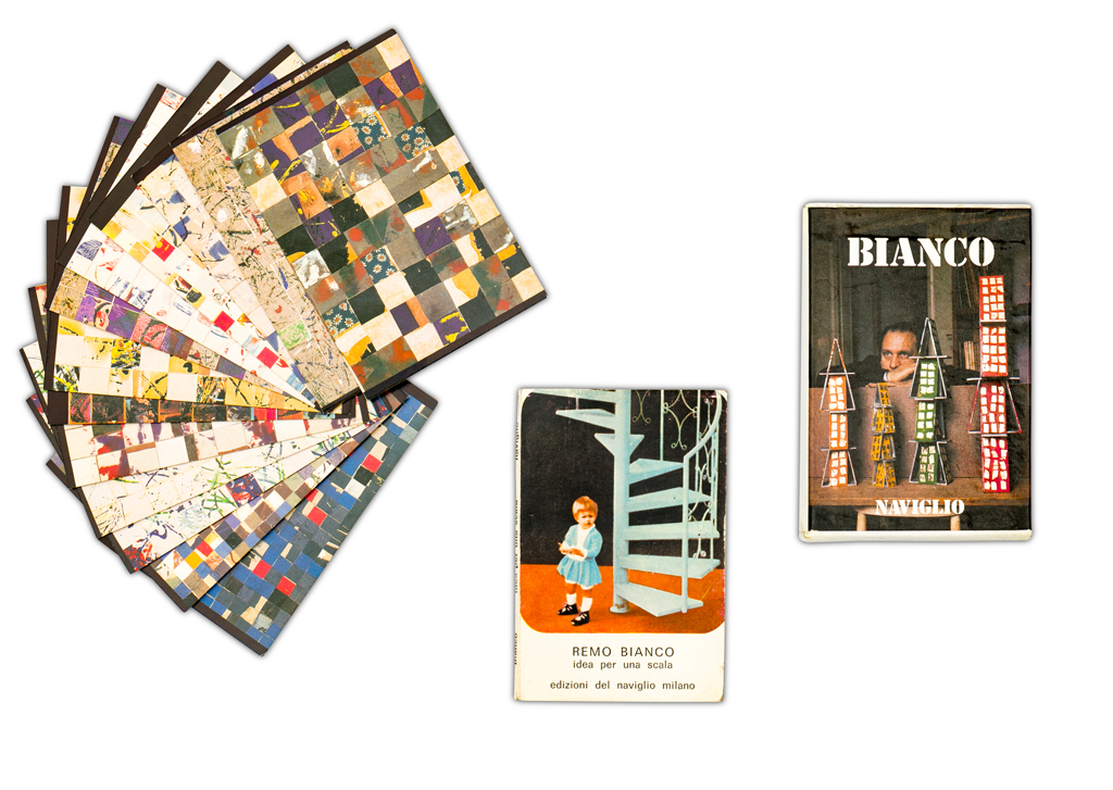Lotto unico composto da un piccolo cofanetto composto da 13 riproduzioni di opere di Remo Bianco, un piccolo catalogo con testo di Alain Jouffroy edito dalla Galleria del Naviglio, Milano, nel 1987, in 500 esemplari numerati (Esemplare 370/500) e un piccolo catalogo 'Idea per una scala' con una nota di Adriano Altamira, edito dalla Galleria del Naviglio, Milano, nel 1972, in 1000 esemplari numerati (Esemplare 704/1000)