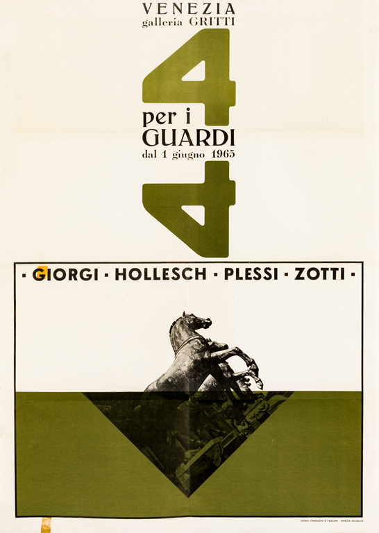 Locandina pieghevole dell'esposizione '4 per i Guardi. Giorgi, Hoellesch, Plessi, Zotti' tenutasi presso la Galleria Gritti di Venezia nel Giugno 1965
