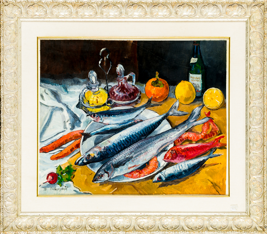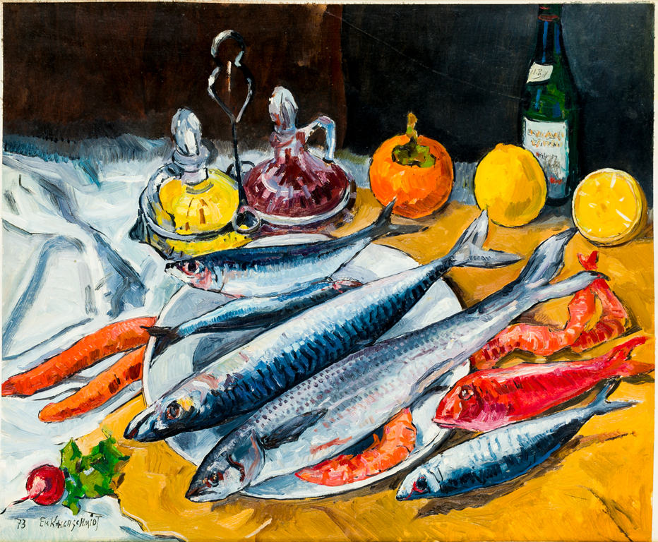 EMILIO KALCHSCHMIDT (1902-1983)Pesci, 1973Tecnica mista su cartone telatocm...