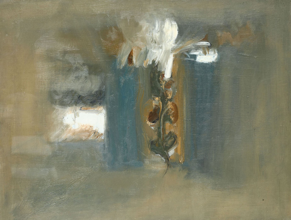 Giancarlo Cazzaniga (1930-2013) Interno con girasoli, 1964 olio su tela, cm 50x65 firmato, intitolato e datato al retro