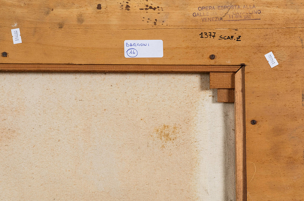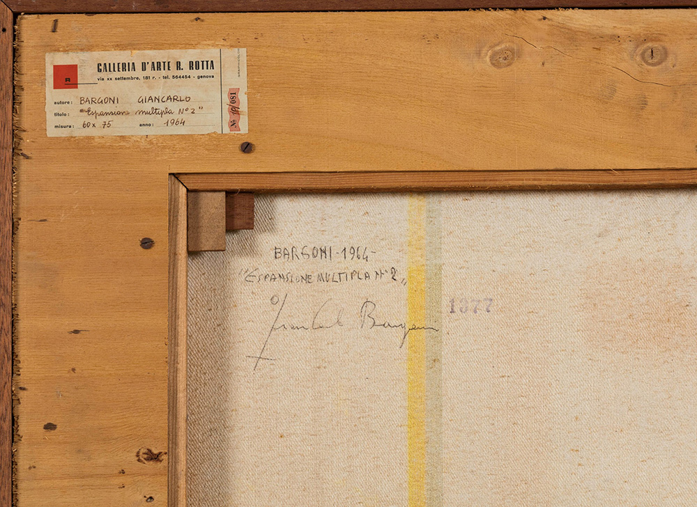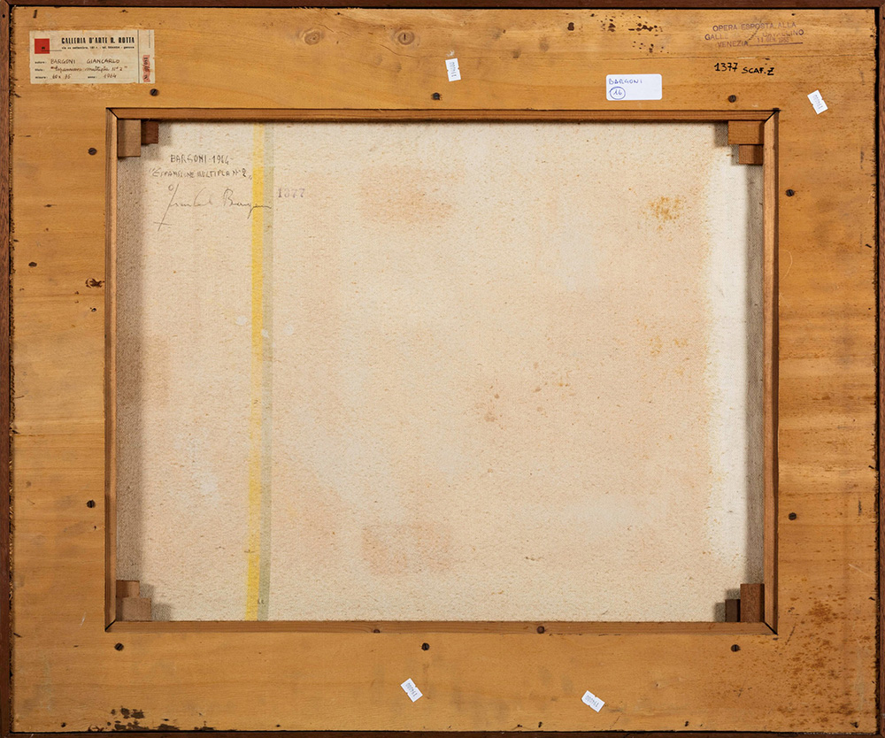 Giancarlo Bargoni (1936) Espansione multipla n. 2, 1964 olio su tela, cm 60x75 firmato, intitolato e datato al retro Etichetta al retro della Galleria Rotta, Genova Timbro al retro: "Opera esposta alla Galleria del Cavallino, Venezia, 11 gennaio 1965"