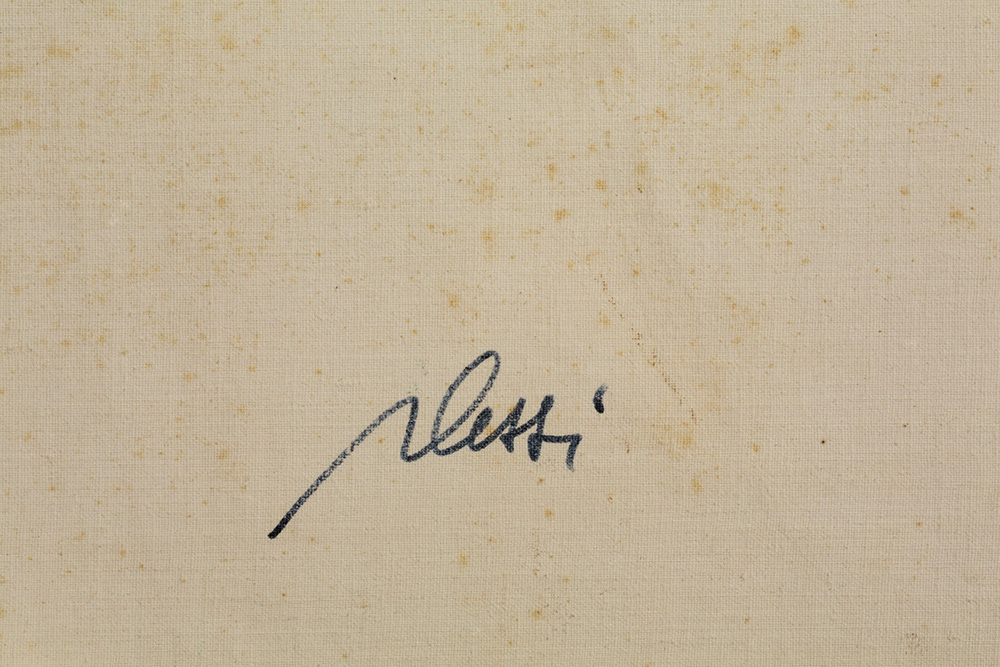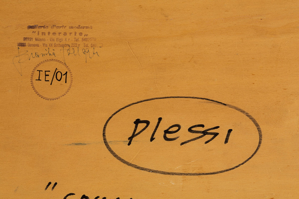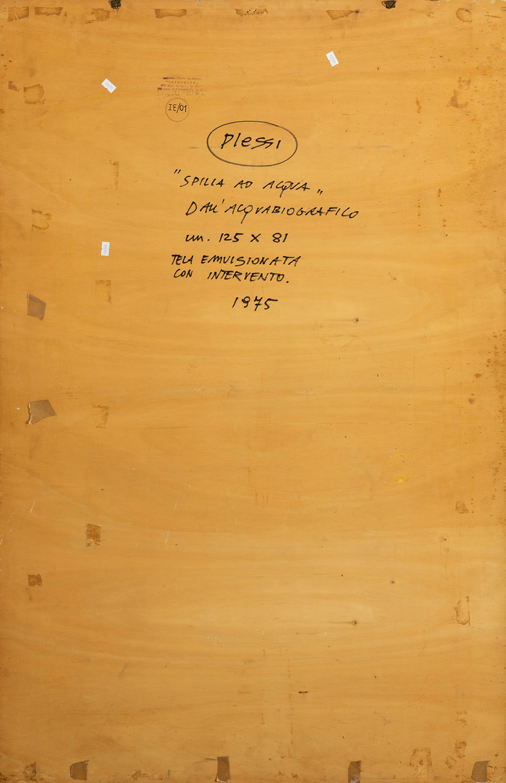 Fabrizio Plessi (1940) Spilla ad acqua, 1975 tela emulsionata con intervento applicato su tavola di legno, cm 125x81 firmato in basso a destra firmato, intitolato e datato al retro Timbro al retro della Galleria Interarte, Milano Presenta segni di foxing su tutta la superficie.
