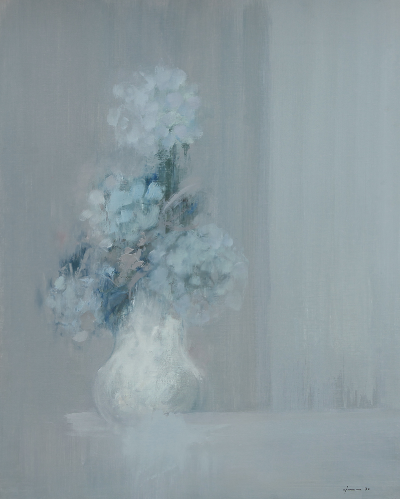 GIUSEPPE AJMONE Carpignano Sesia 17/02/1923 - 07/04/2005 Ortensie, 1970 olio su tela cm. 81x65, firma e anno in basso a destra, titolo e anno al retro, dichiarazione d'autenticità dell'artista su foto, opera registrata presso l'Archivio Giuseppe Ajmone come da dichiarazione su foto.