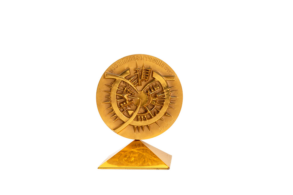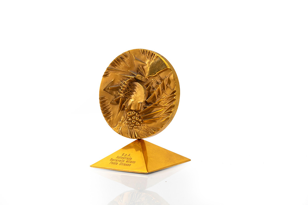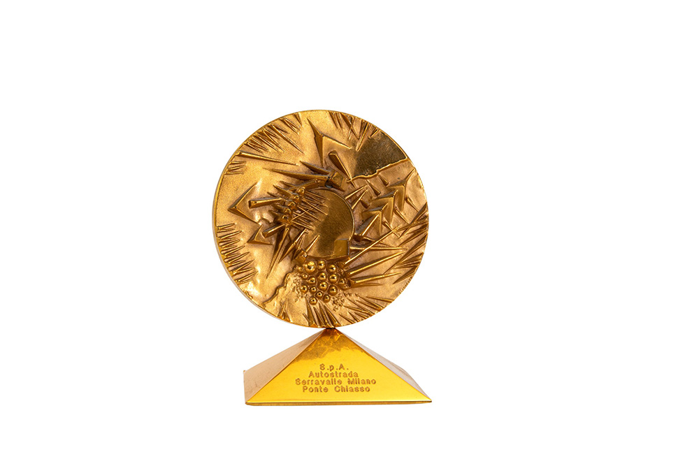 Arnaldo Pomodoro (1926) Medaglia in metallo dorato, diametro cm 8, montata su base piramidale, studiata dal Maestro nel 1990 per la Società Milano Serravalle in occasione del trentennale dell’autostrada omonima ed eseguita con il metodo a conio dallo Stabilimento Stefano Johnson di Milano in una tiratura di 1000 esemplari. Opera registrata presso l’Archivio Arnaldo Pomodoro, Milano, con il n. M/90/4