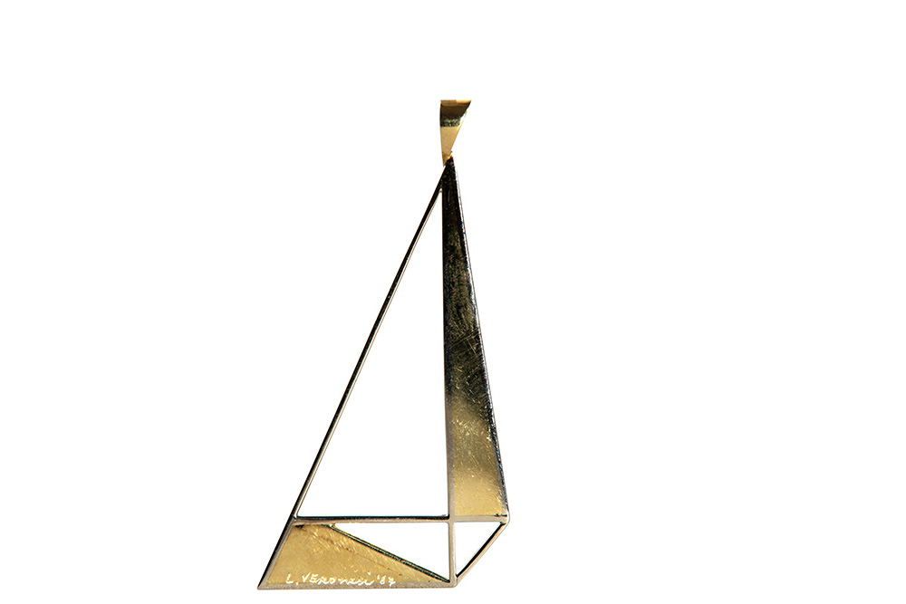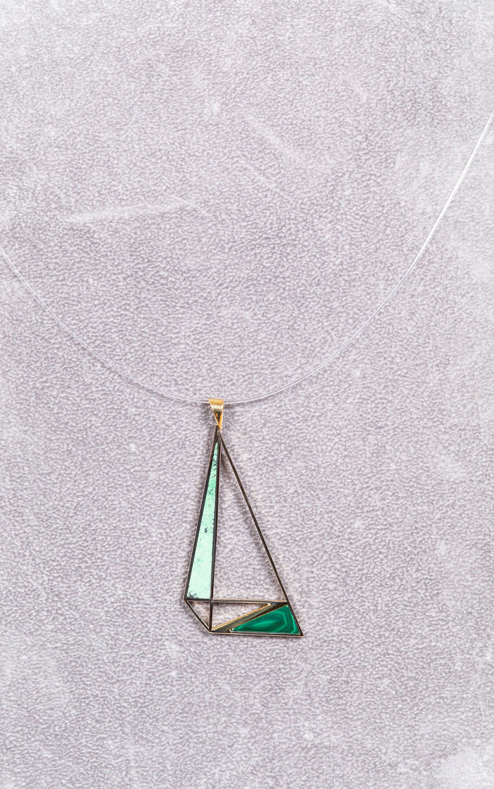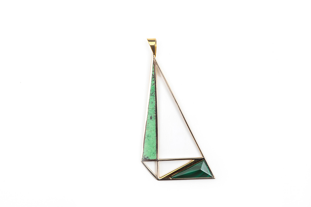 Luigi Veronesi (1908-1998) Pendente in oro bianco malachite e pietra dura tinta, 1987 design esclusivo e di stile geometrico, con all'interno degli elementi in malachite e pietra dura tinta, punzone 750, cm 5,5x3 firmato e datato