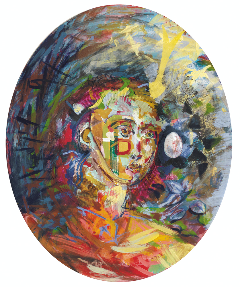 BRUNO CECCOBELLI Montecastello Vibio (Pg) 02/09/1952 L'uovo di Maria, 1995 tecnica mista, collage ed inserto di piatto in plastica su tela ovale su cm. 60x40, firma, titolo e anno al retro, opera registrata presso l'Archivio Ceccobelli come da dichiarazione su foto, certificato d'autenticità della Elite Shopping (MI) allegato.