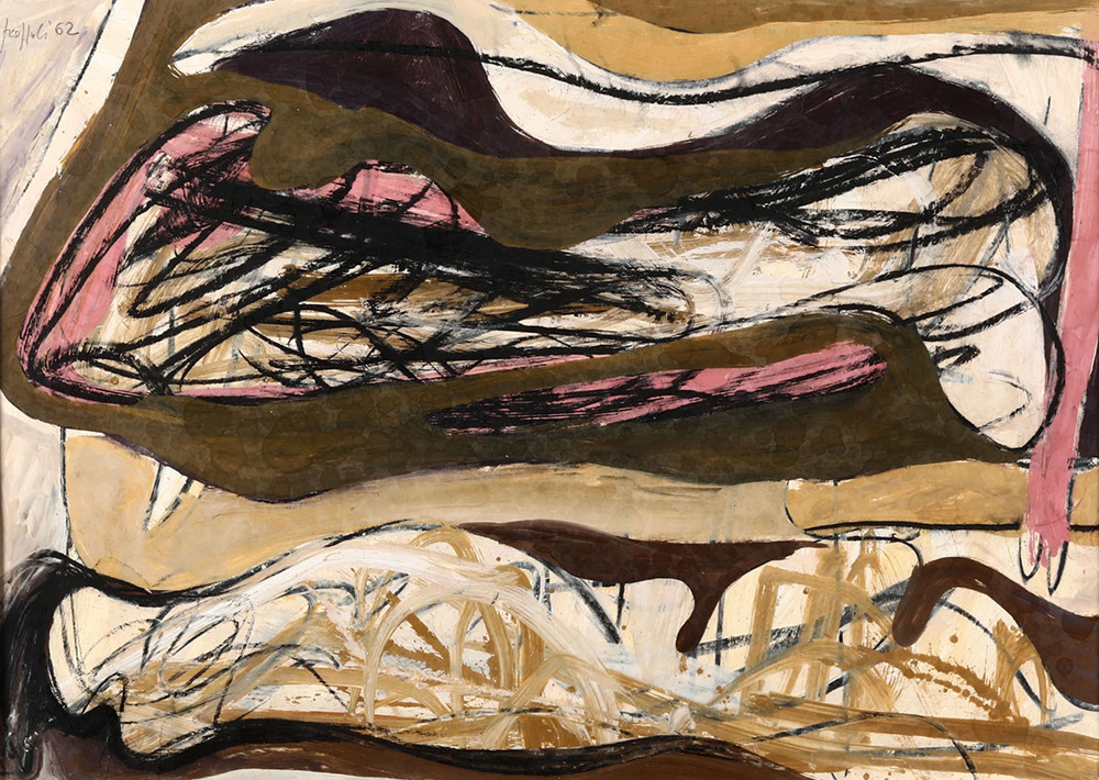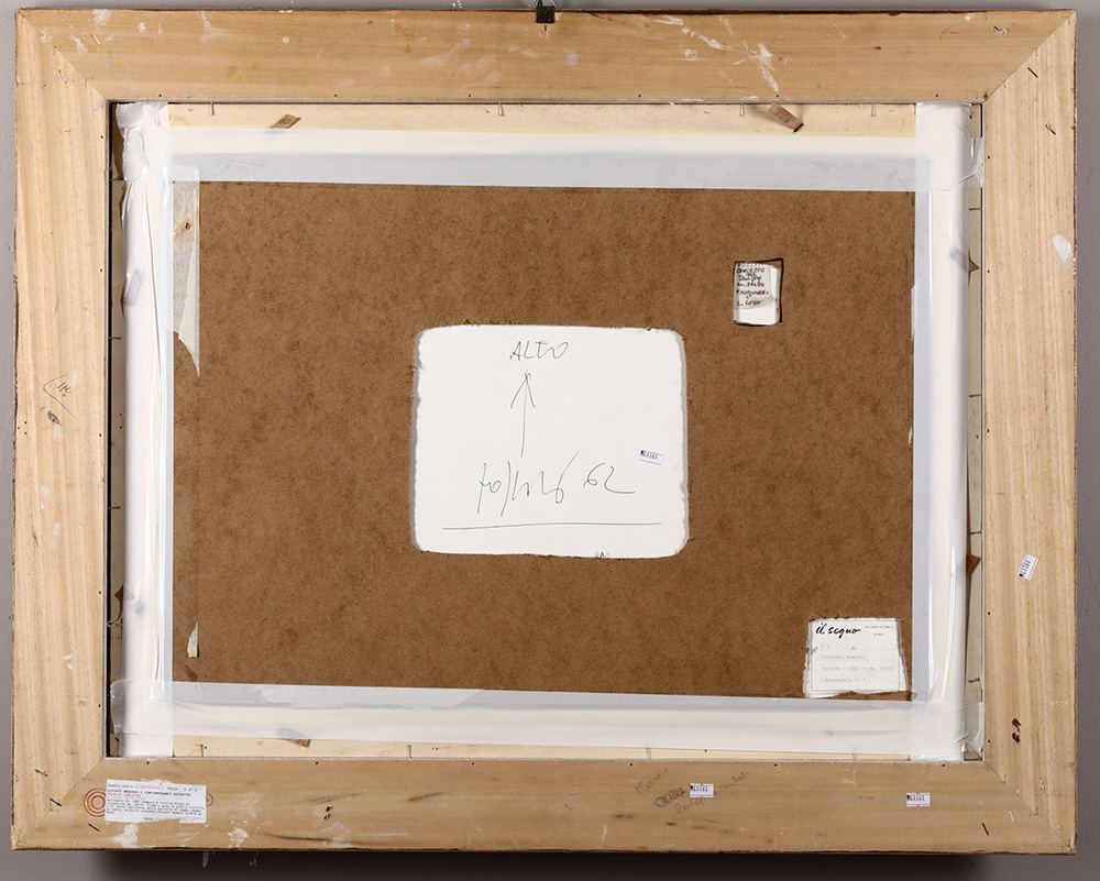 Concetto Pozzati (1935) Nazionale II, 1962 tempera e tecnica mista su cartoncino, cm 50x70 firmato e datato in alto a destra firmato e datato al retro Etichetta al retro della Galleria Il Segno, Roma Opera registrata presso l’Archivio Generale Concetto Pozzati, Cesena, con il n. 1138/6 Provenienza: Meeting Art, Vercelli Collezione privata, Genova Bibliografia: Concetto Pozzati, Archivio Generale, Maretti Editore, Tomo 1, n. 1138, p. 32