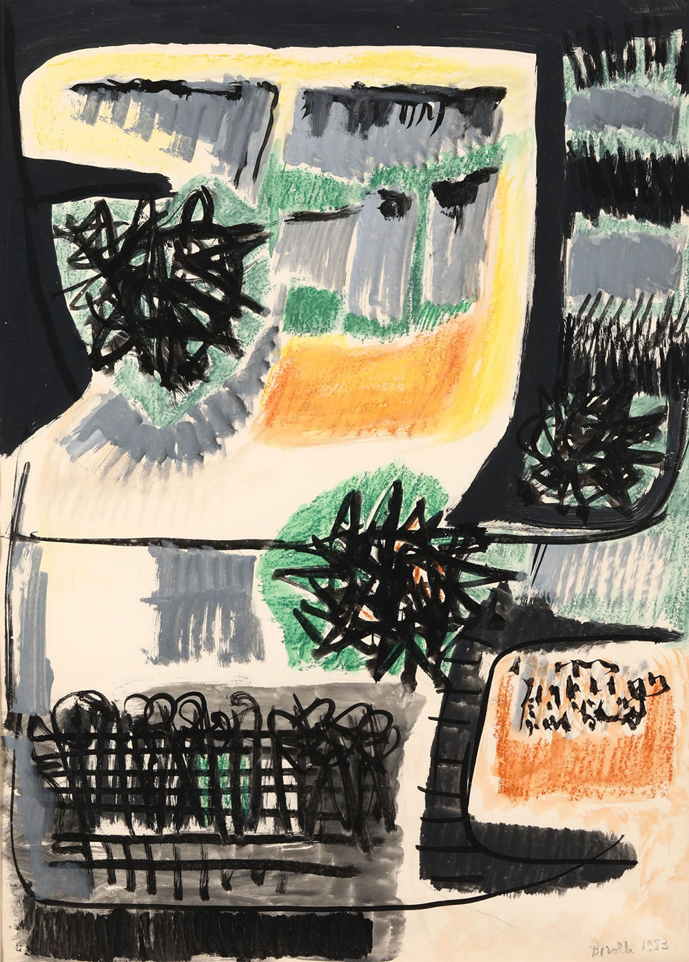 Renato Birolli (1905-1959) Senza titolo - Falcette e roncole, 1953 tecnica mista su cartone, cm 68x50 firmato e datato in basso a destra Etichetta al retro della Galleria Cesarea, Genova Etichetta al retro di Arte Fiera, Bologna, 1997 Provenienza: Galleria d’Arte Cesarea, Genova Collezione privata, Genova