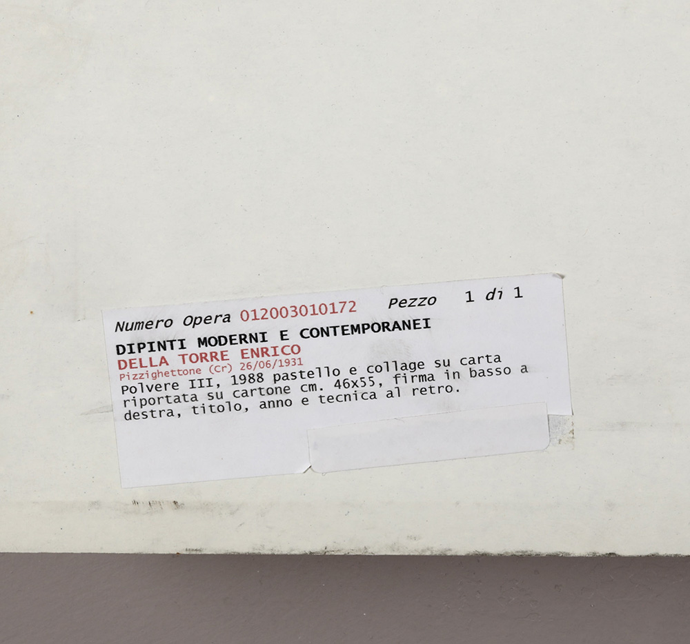 Enrico Della Torre (1930) Polvere III, 1988 pastello e collage su carta riportata su cartone, cm 46x55 firmato in basso a destra firmato ed intitolato al retro Esposizioni: Enrico della Torre. Opere su carta 1956-1989, PAC, Milano, 19 ottobre - 26 novembre 1989 Bibliografia: Luisa Somaini, Enrico della Torre. Opere su carta 1956-1989, Arnoldo Mondadori Editore Arte, Milano, 1989, p. 30