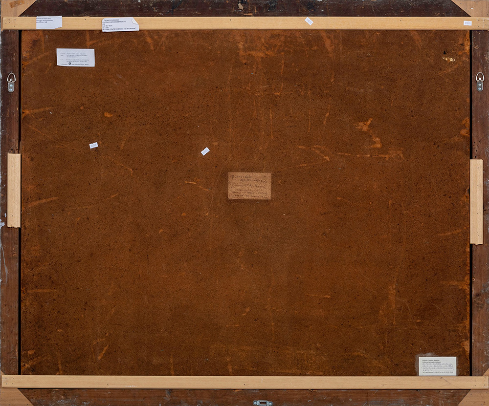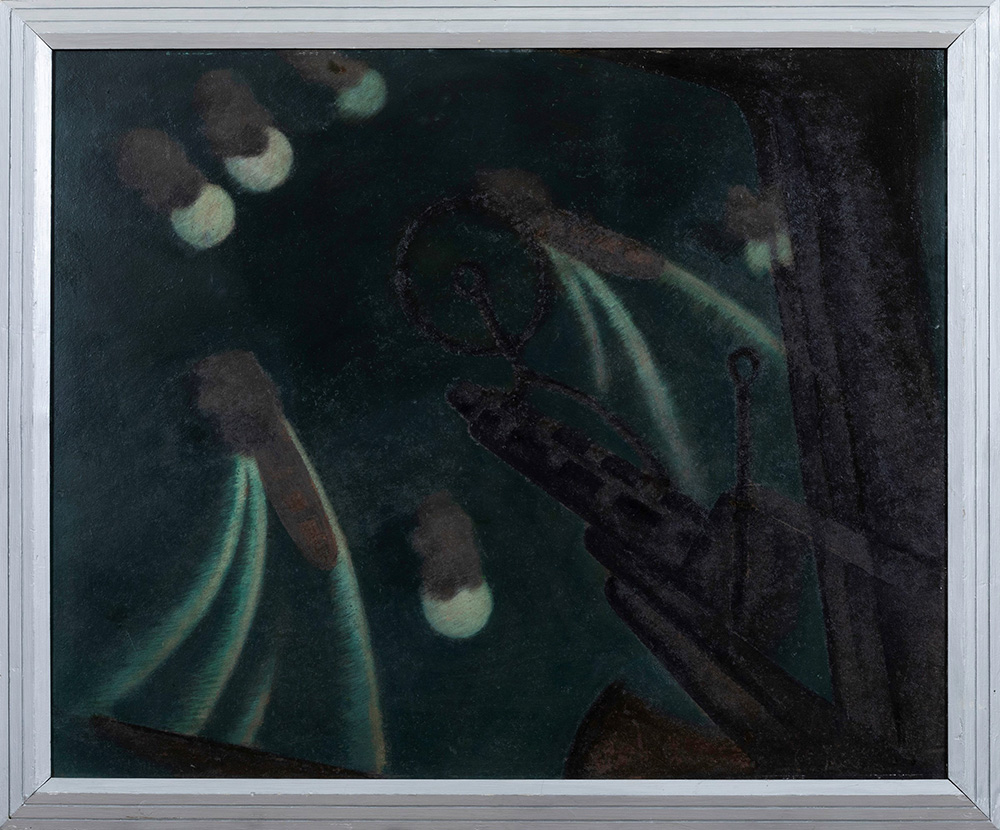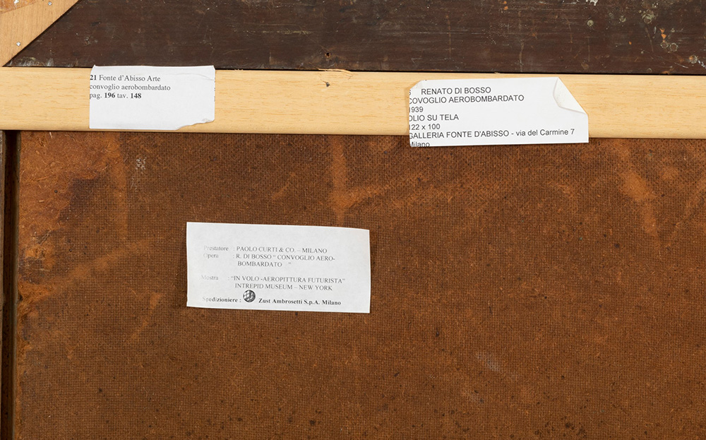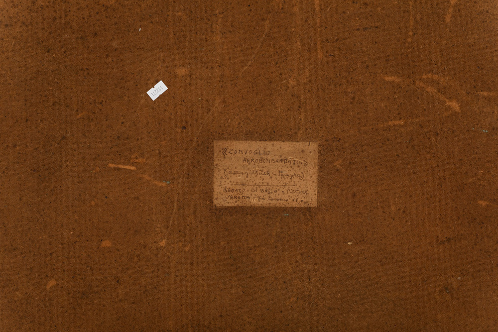 Renato Di Bosso (1905-1982) Convoglio Aerobombardato, 1939 olio su faesite, cm 100x122 Etichetta al retro della Galleria Fonte d’Abisso, Milano L’opera presenta segni lungo i margini, dovuti alla cornice e ritocchi