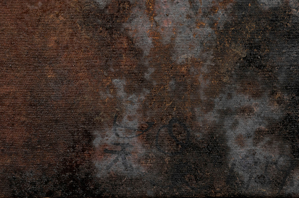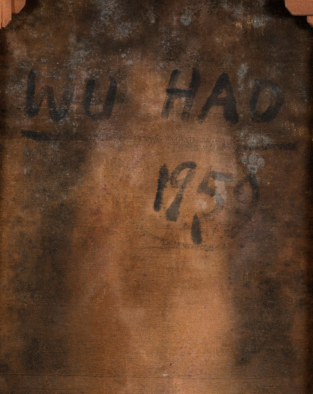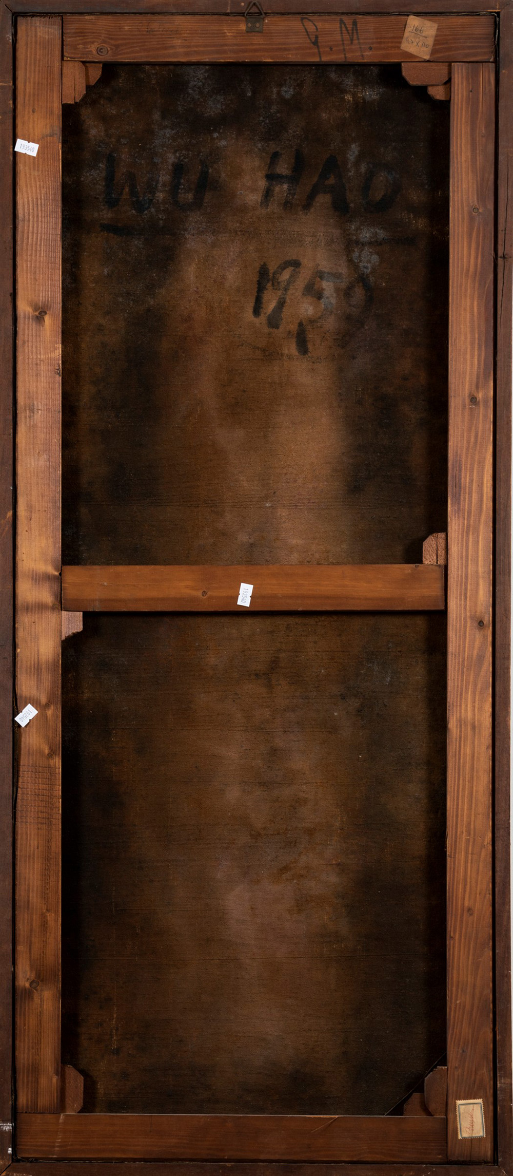 Hao Wu (1930) Senza titolo, 1959 olio su tela, cm 113x47,5 firmato in basso a destra firmato e datato al retro Presenta segni di muffa in forma di alone bianchi sparsi sui bordi. Muffa presenta anche al retro.