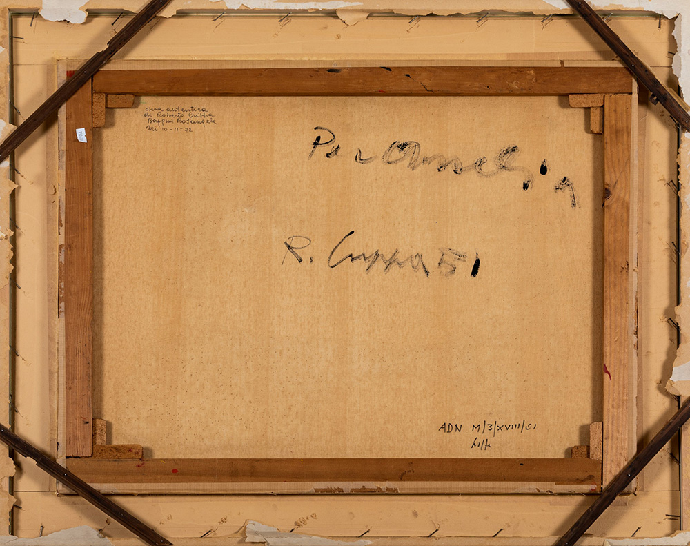 Roberto Crippa (1921-1972) Spirali, 1951 tecnica mista su tela, cm 50x70 firmato, datato e dedicato al retro Autentica su fotografia a cura di Roberto Crippa, con il n. ADN M/3/XVIII/01 L’opera presenta mancanze di colore, ingiallimento della vernice e mancanze di colore nella parte centrale verso destra