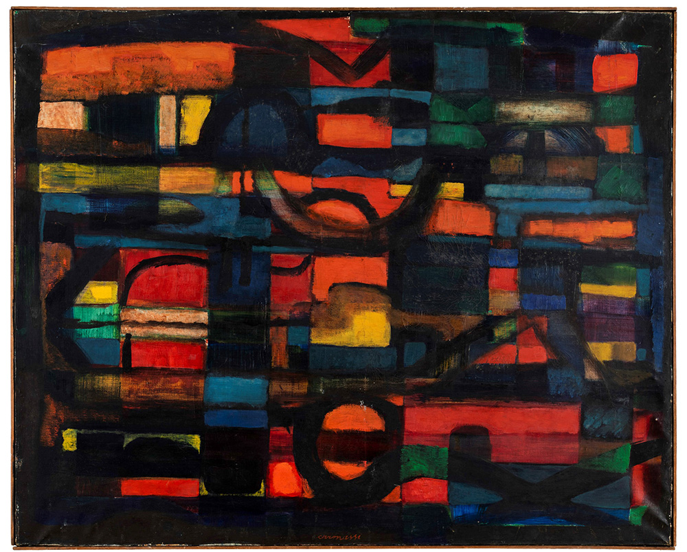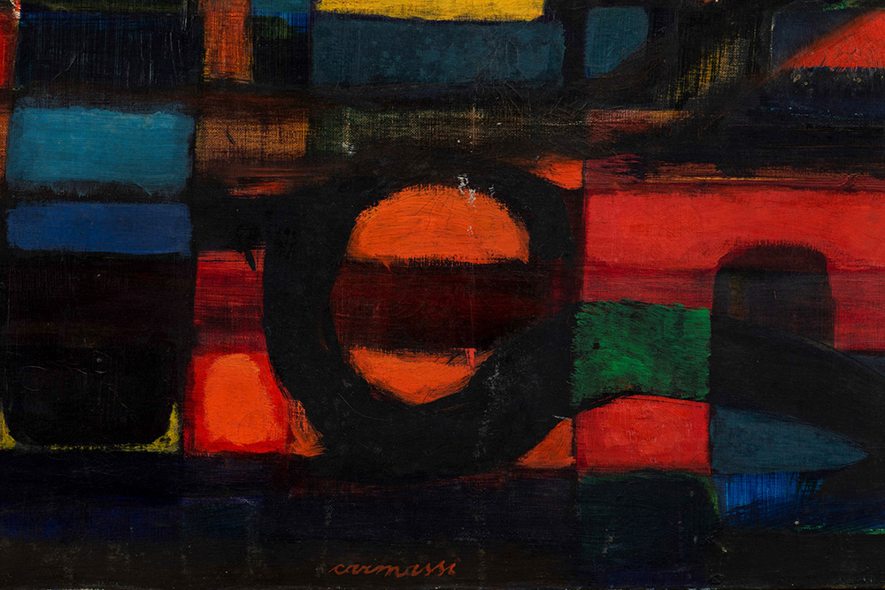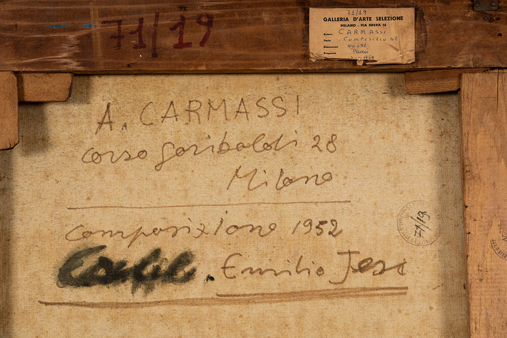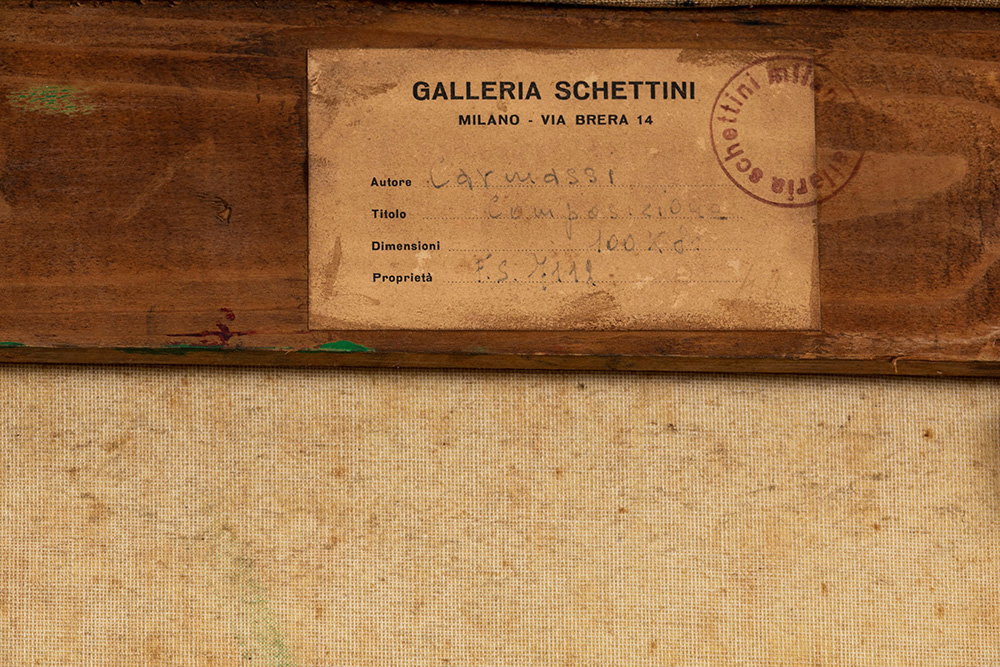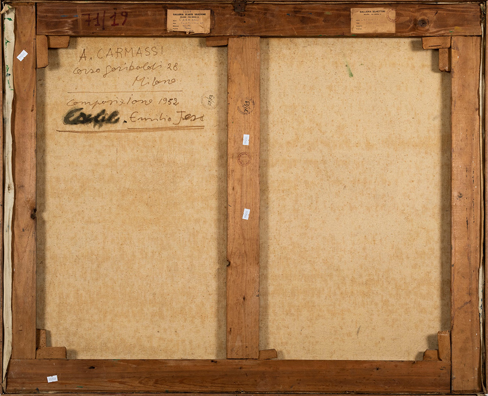 Arturo Carmassi (1925 - 2015) Composizione, 1952 olio su tela, cm 81x100 firmato in basso al centro firmato, intitolato e datato al retro Etichetta al retro della Galleria D’Arte Selezione, Milano Timbro ed etichetta al retro della Galleria Schettini, Milano Presenta una patina di muffa, craquelure sulla superficie e mancanze di colore sui bordi.