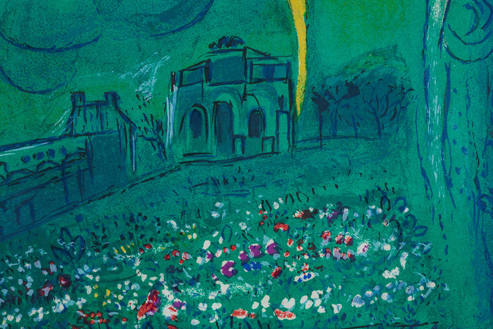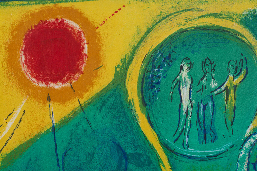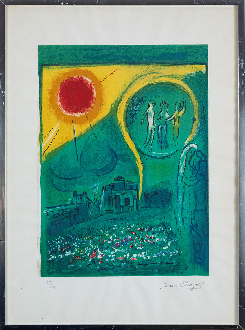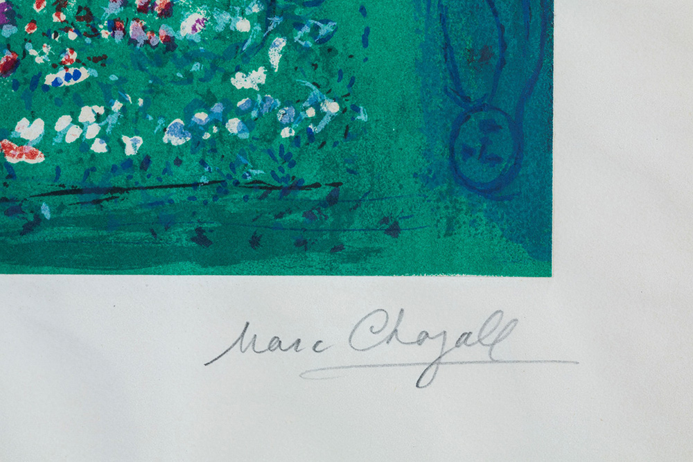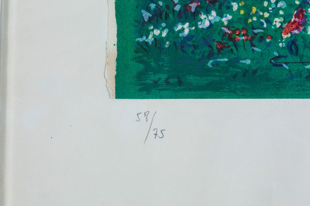 Marc Chagall (1887-1985) Le carrousel du Louvre, 1954 litografia a colori, cm 38x28 firmata in basso a destra es. 58/75 Opera commissionata dalla galleria Maeght di Parigi per il catalogo della mostra dell'artista avente come tema la capitale francese. Il catalogo fu poi pubblicato come numero speciale del periodico Derriere le Miroir. Pubblicata da Maeght Editeur di Parigi e stampata all'Atelier Mourlot sempre di Parigi