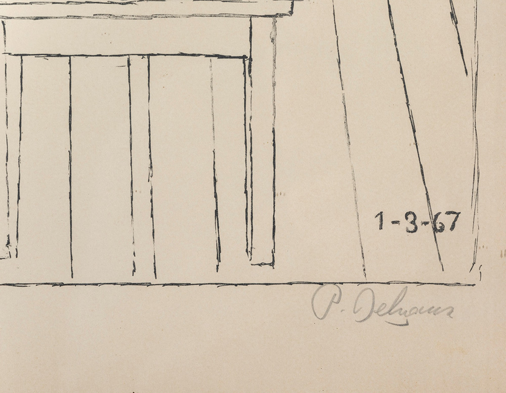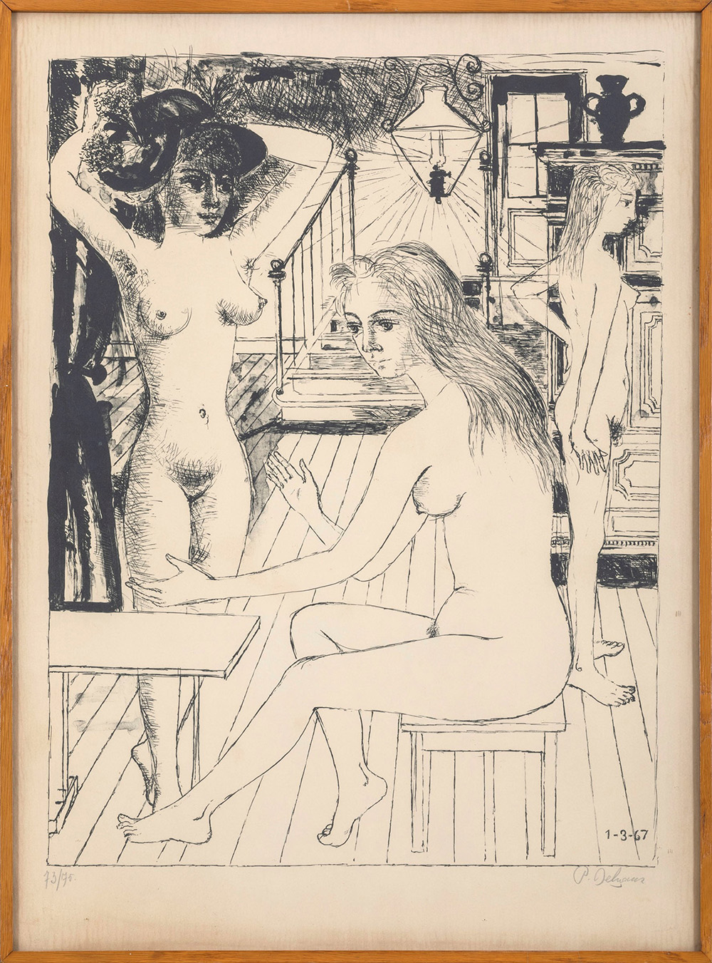 Paul Delvaux (1897-1994) Les Jeunes Filles, 1967 litografia su carta, cm 75x65 firmato in basso a destra es. 73/75 Bbliografia: Mira Jacob, Paul Delvaux: Graphic Work, Rizzoli, New York, 1976, p. 13 Imbrunimento della carta, probabilmente dovuto al sostegno al retro