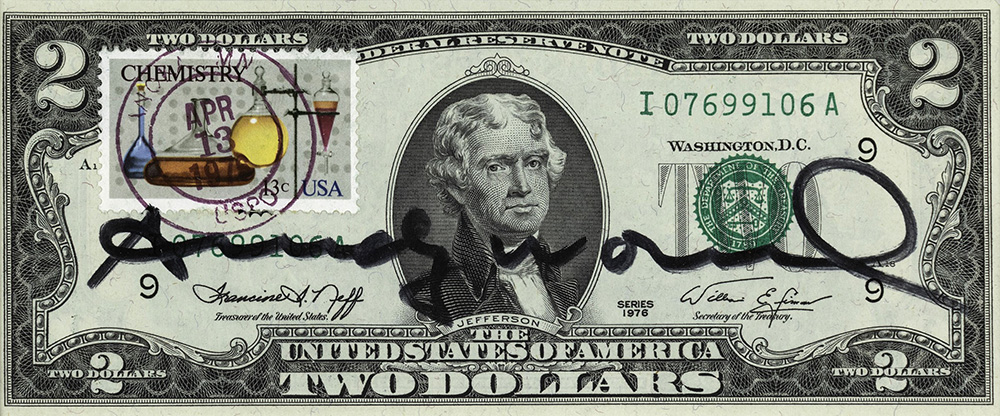Andy Warhol (1928-1987) Two dollars carta, cm 7x15 firmato L’opera si presenta in buono stato di conservazione