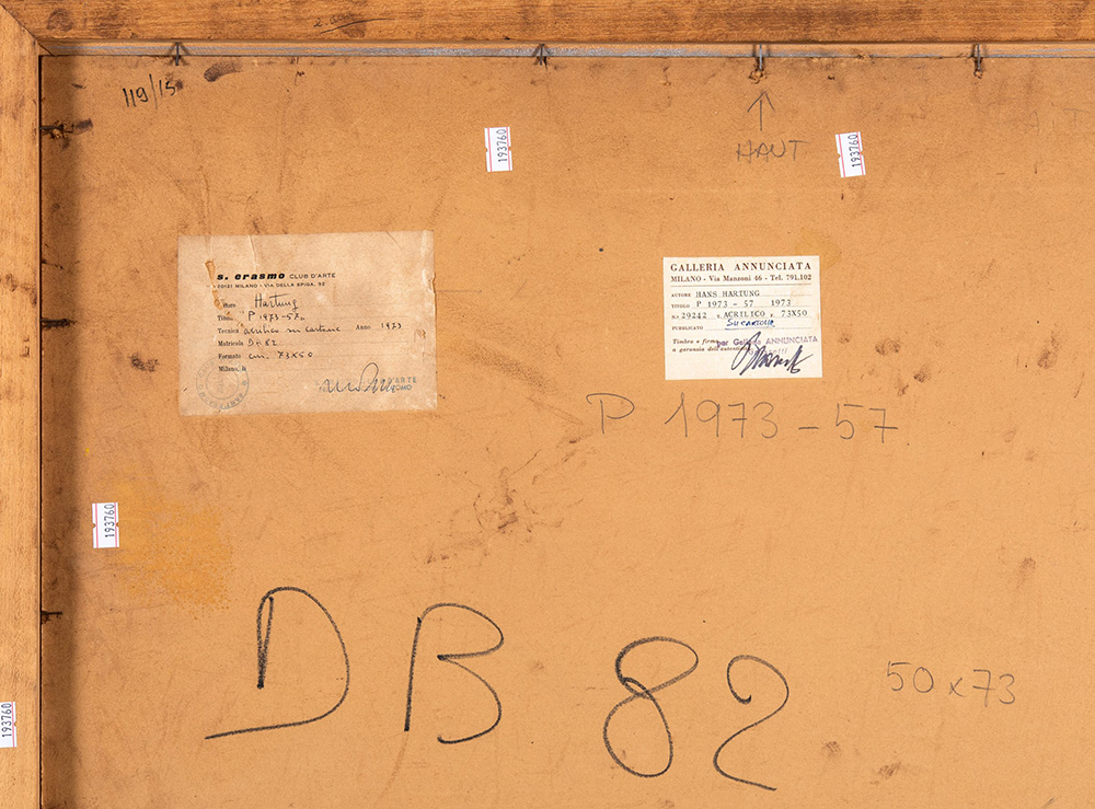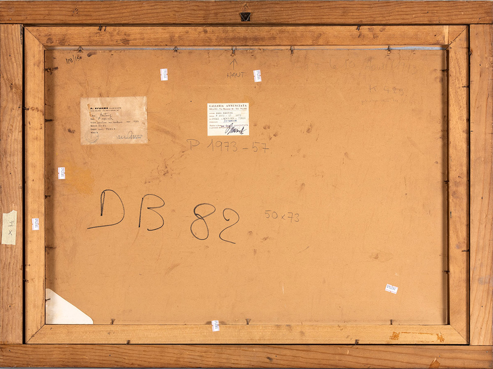 Hans Hartung (1904-1989) P 1973-57, 1973 acrilico e pastelli su cartone barritato, cm 50x73 firmato e datato in basso a destra Etichetta al retro della Galleria Annunciata, Milano Opera registrata presso la Fondazione Hans Hartung e Anna Eva Bergman con il n. P1973-57 L’opera verrà pubblicata sul Catalogo Generale delle opere di Hans Hartung edito dalla Fondazione Hartung Bergman. Provenienza: Collezione privata, Roma Collezione privata, Genova