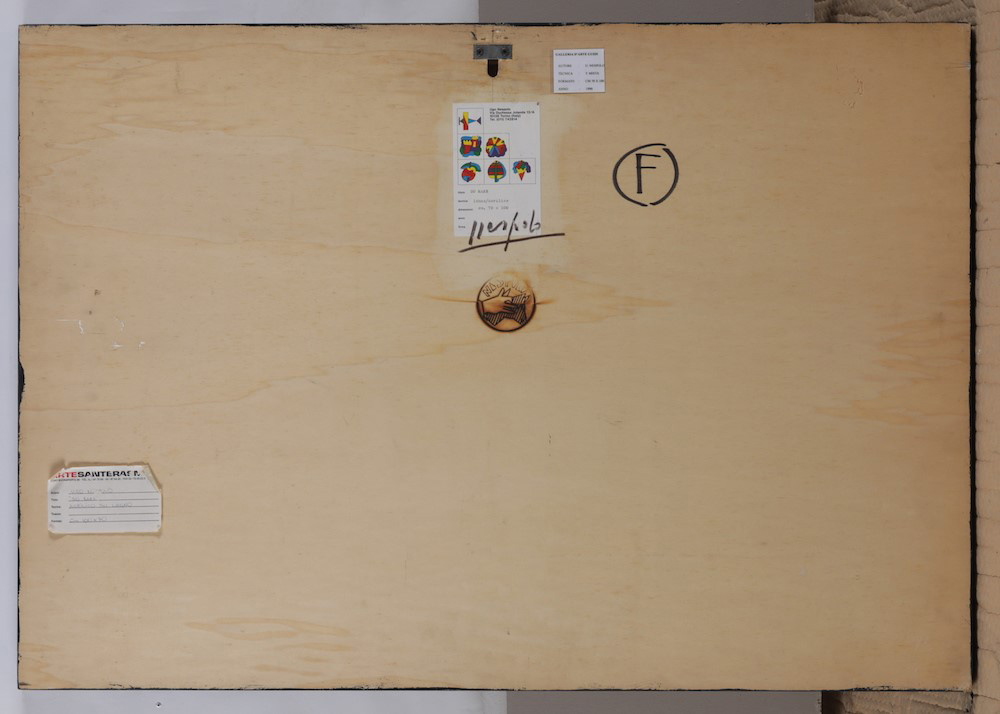 Ugo Nespolo (1941) So rare, 1990 acrilici su legno, cm 70x100 firmato in basso a sinistra Timbro ed etichetta firmata dall’artista al retro Etichetta al retro della Galleria Artesanterasmo, Milano Autentica su fotografia dell’artista in buono stato conservativo, presenta lievi tracce di sporco