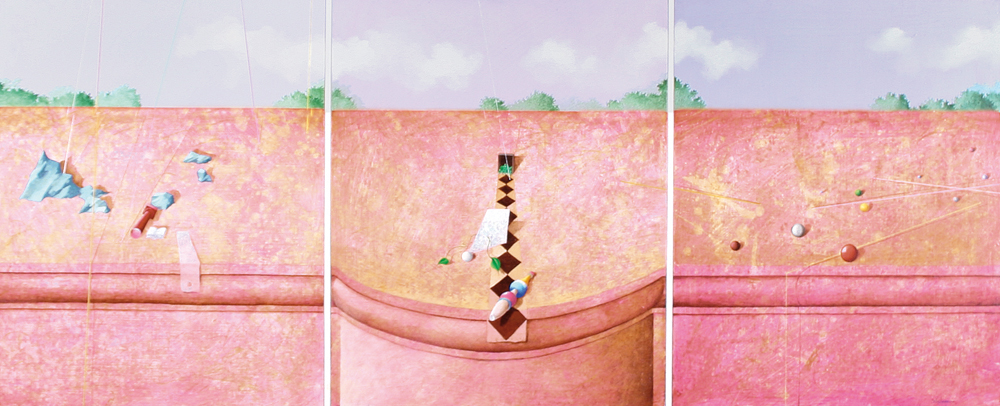 FRANCESCO STEFANINI Versilia 1948 Un'idea classica, 1985 trittico, olio su tela applicata su tavola cm. 40x90, firma in basso a destra, firme, titolo e anni al retro, dichiarazione d'autenticità dell'artista su foto, pubblicata sul catalogo della mostra "A Est E A Ovest DEL CREPUSCOLO" tenutasi ad Asolo, Ex Convento di S.Pietro dal 7 al 30 settembre 1985, pagina 45.