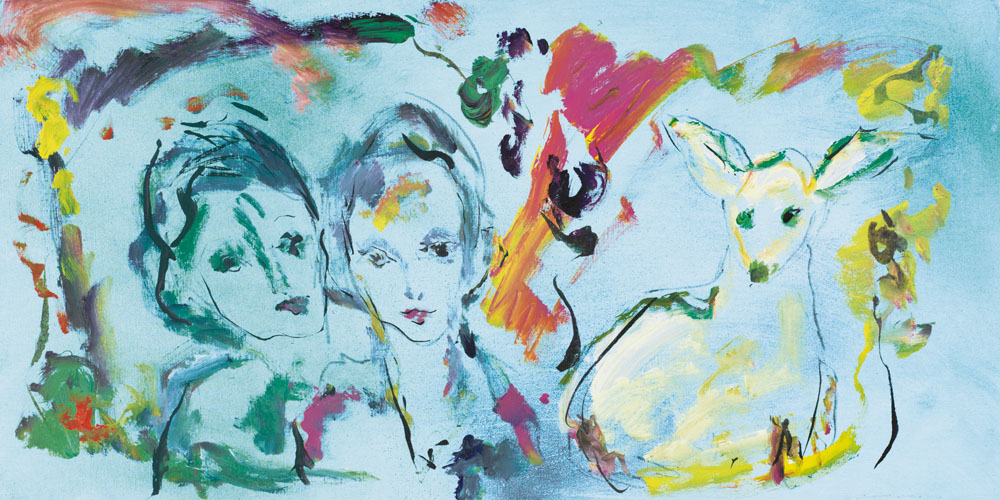ERNESTO TRECCANI Milano 26/08/1920 - Milano 27/11/2009 Pino e Daniele con cerbiatto olio su tela cm. 45x95, firma in basso a destra e al retro, certificato di garanzia della SIL.PA s.r.l. allegato, opera registrata presso la Fondazione Ernesto Treccani come da certificato allegato.