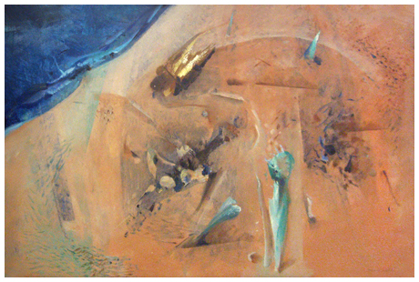GIUSEPPE MARTINELLI Viareggio 1930 – Milano 2016 I primi narcisi marini Olio e applicazioni miste su tela 40 x 60. Firma in b. a d.; sul verso titolo, tecnica, misure e firma. base: 100