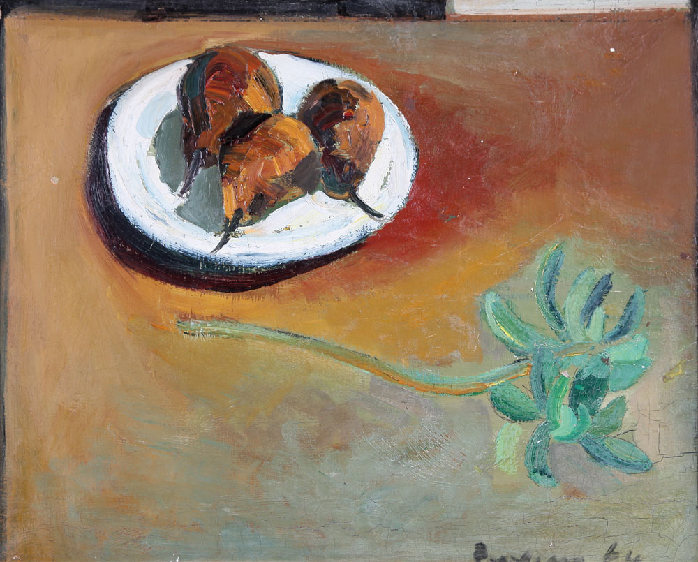 SALVATORE PROVINO Bagheria (Pa) 04/06/1943 Natura morta con pere e fiore, 1964 olio su tela cm. 40x50, firma e anno in basso a destra e al retro, dichiarazione d'autenticità dell'artista su foto.