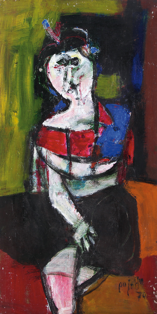 GUIDO PAJETTA Monza (Mi) 08/02/1898 - Milano 15/02/1987 Figura seduta, 1974 acrilico su tela cm. 70x35, firma e anno in basso a destra, opera registrata presso l'archivio Guido Pajetta come da dichiarazione su foto.