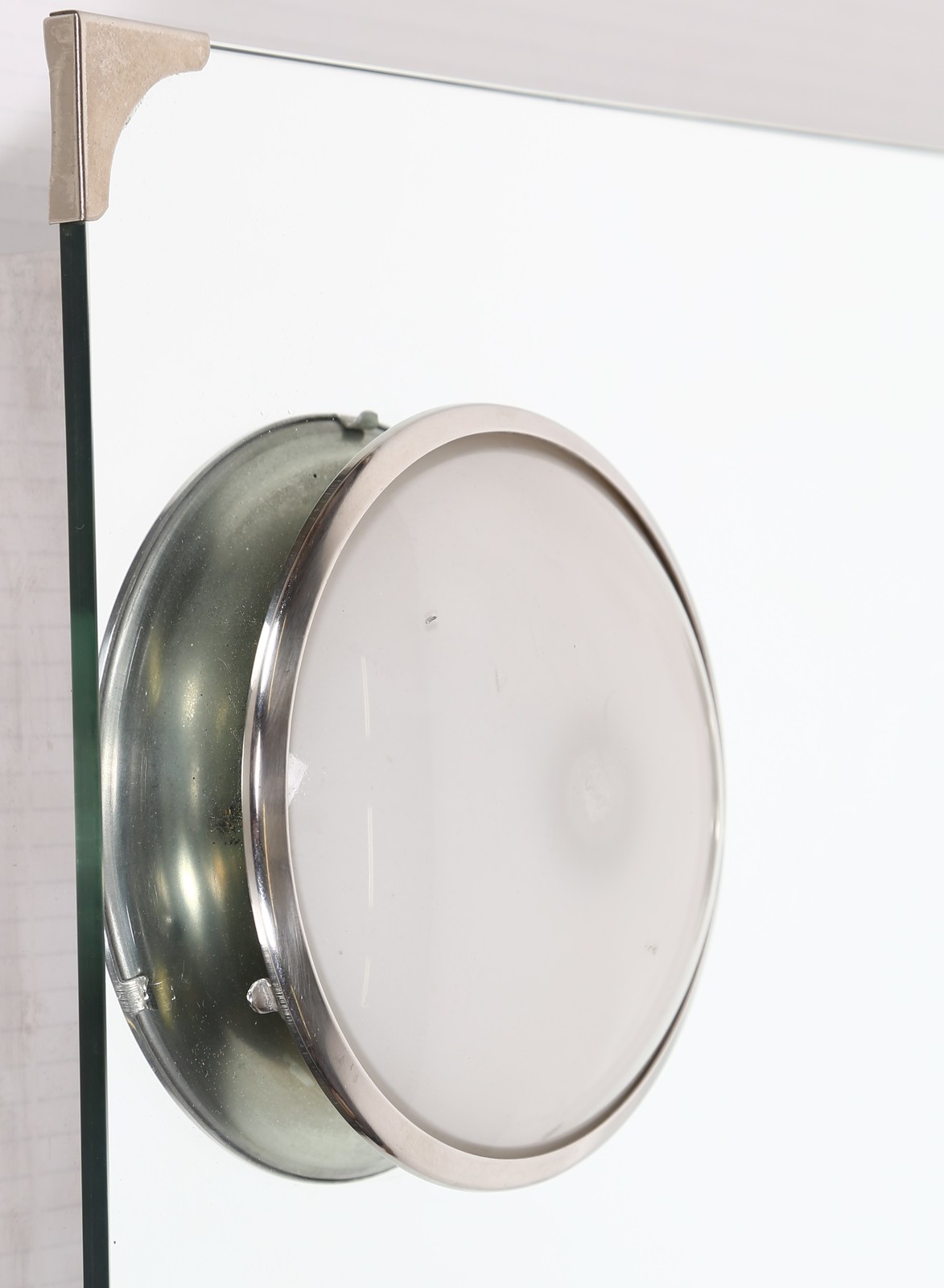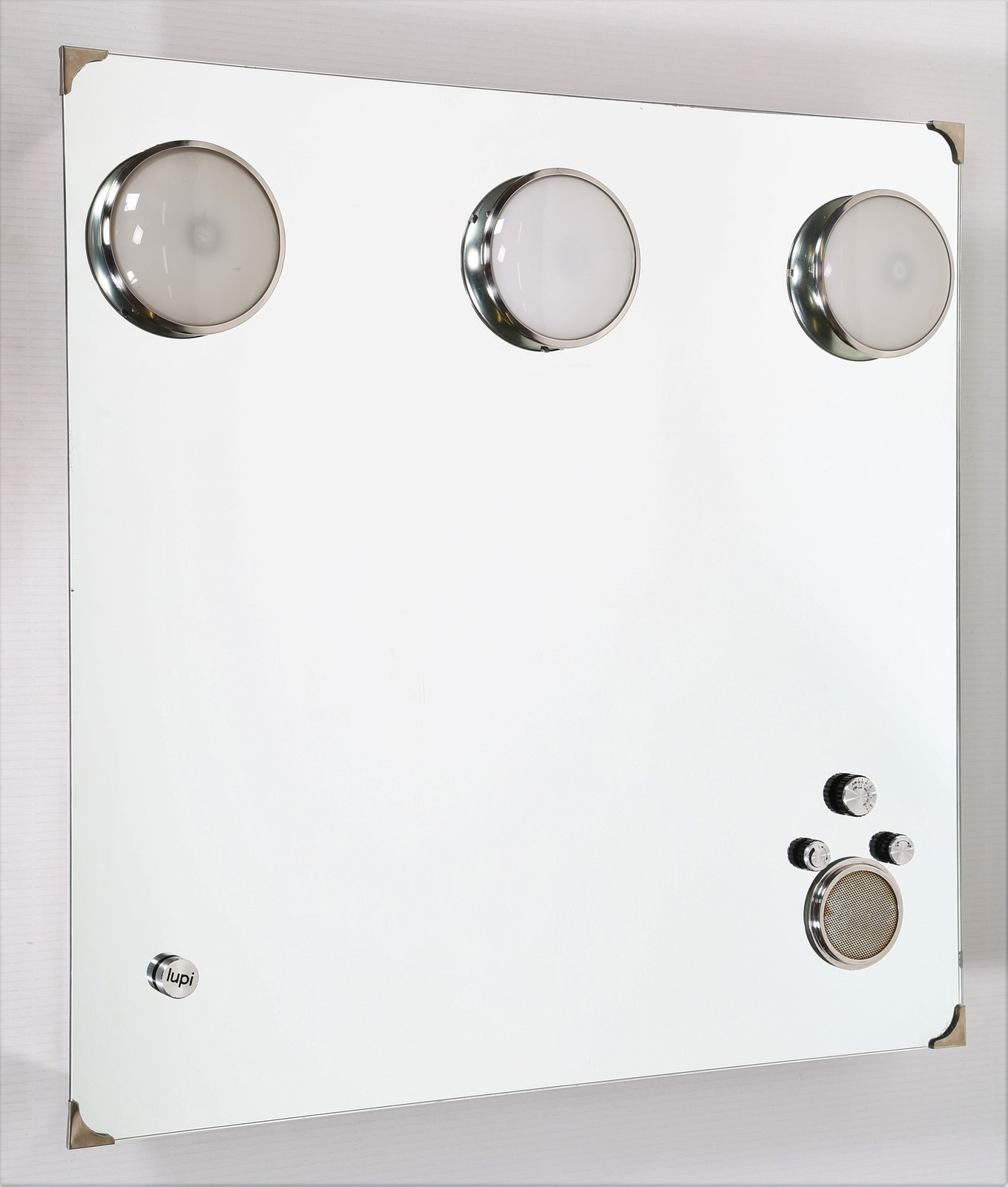 ITALIAN MANUFACTURE Mirror with lights and radio. Metal and mirror. Cm 75,00 x 75,00 x 10,00. Chromed metal and mirror, for Cristal Lupi Luxor, 60s.