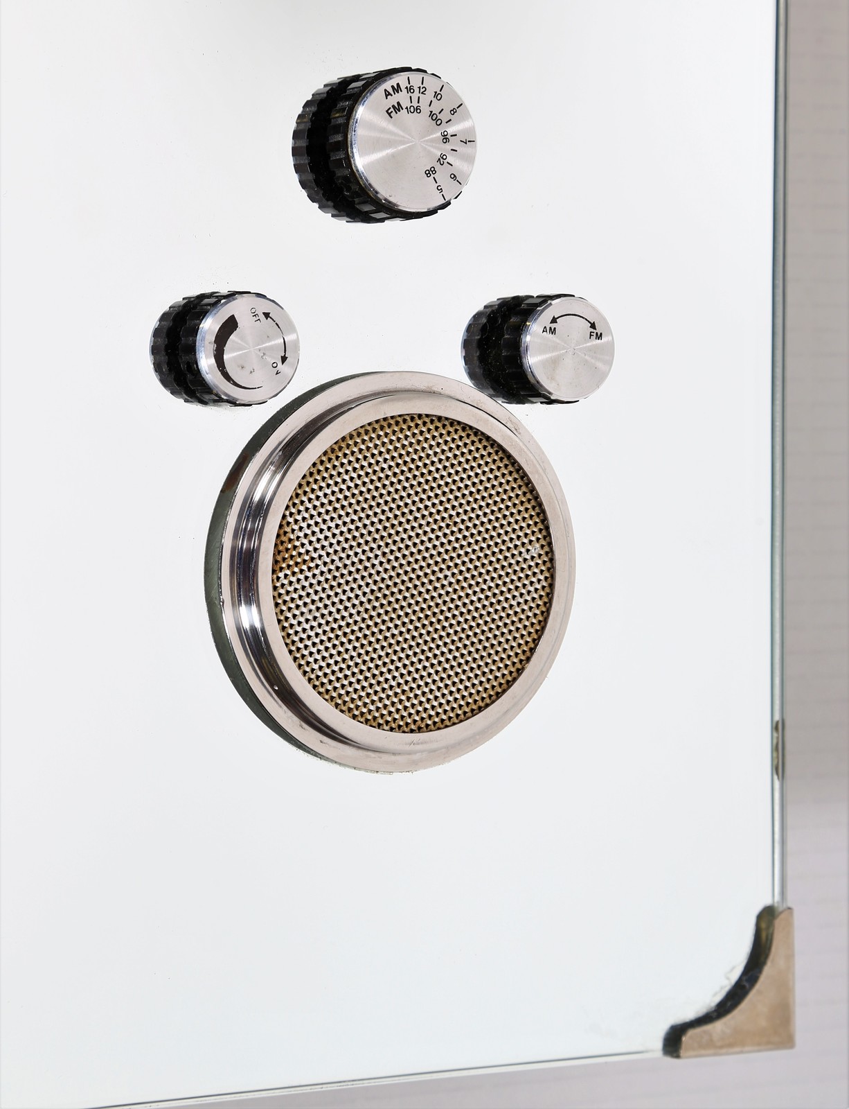 MANIFATTURA ITALIANA Specchio con luci e radio . Metallo e specchio. Cm 75,00 x 75,00 x 10,00. Metallo cromato e specchio, produzione Cristal Lupi Luxor anni 60